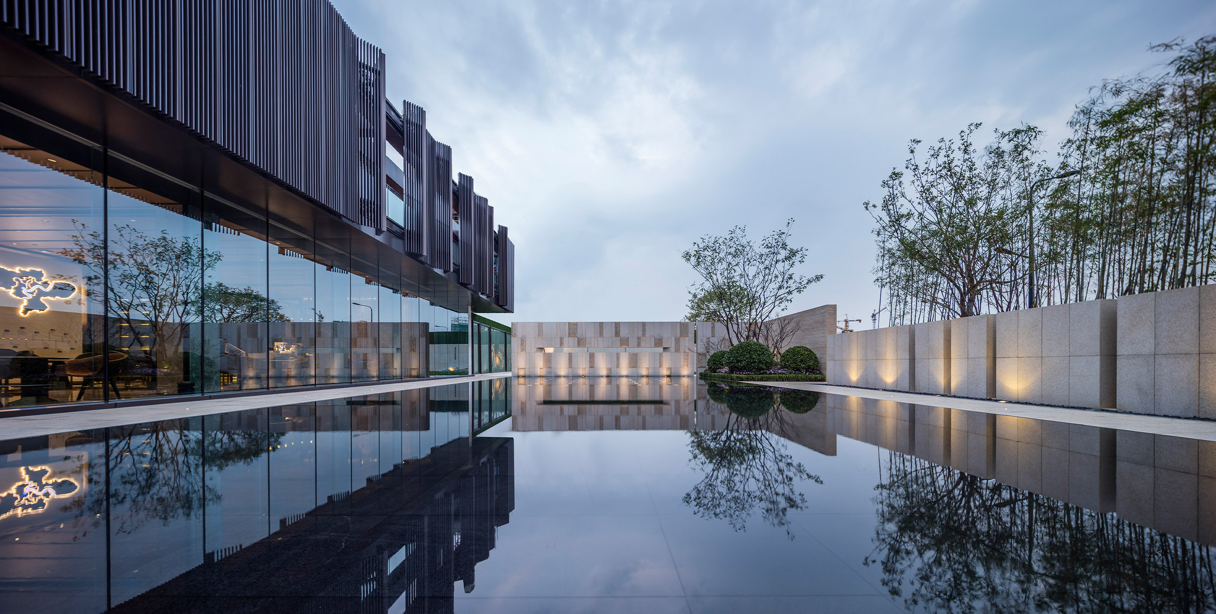 夜晚建筑内的空间通过户外的浅水面投射出丰富的镜像效果,整体 建筑外立面完全和室内衔接、延伸。内院式的景观很好的阻隔了户外繁杂的路面,从入口进入里面就能感受到 一个安静的景观空间。