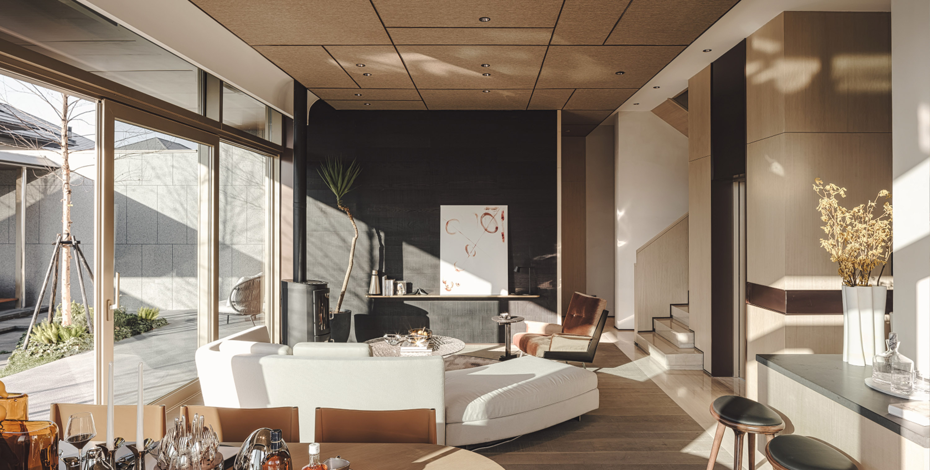 一楼和二楼空间围绕着大客厅进行组织。两层挑高体验的客餐厅背景墙延续了工作室的火烧木材质,各个功能区在视觉上得以延续,形成统一感。