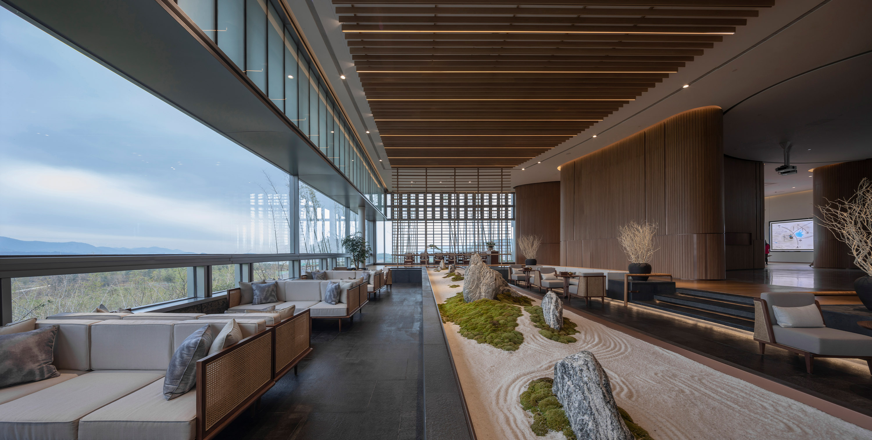 大厅采用了下沉式设计,大面积玻璃窗景,无障碍阻挡,能够直视远山,仿佛置身于山之中,立于窗前,可将不远处的阳羡湖畔,竹林波涛起伏之景尽收眼底。