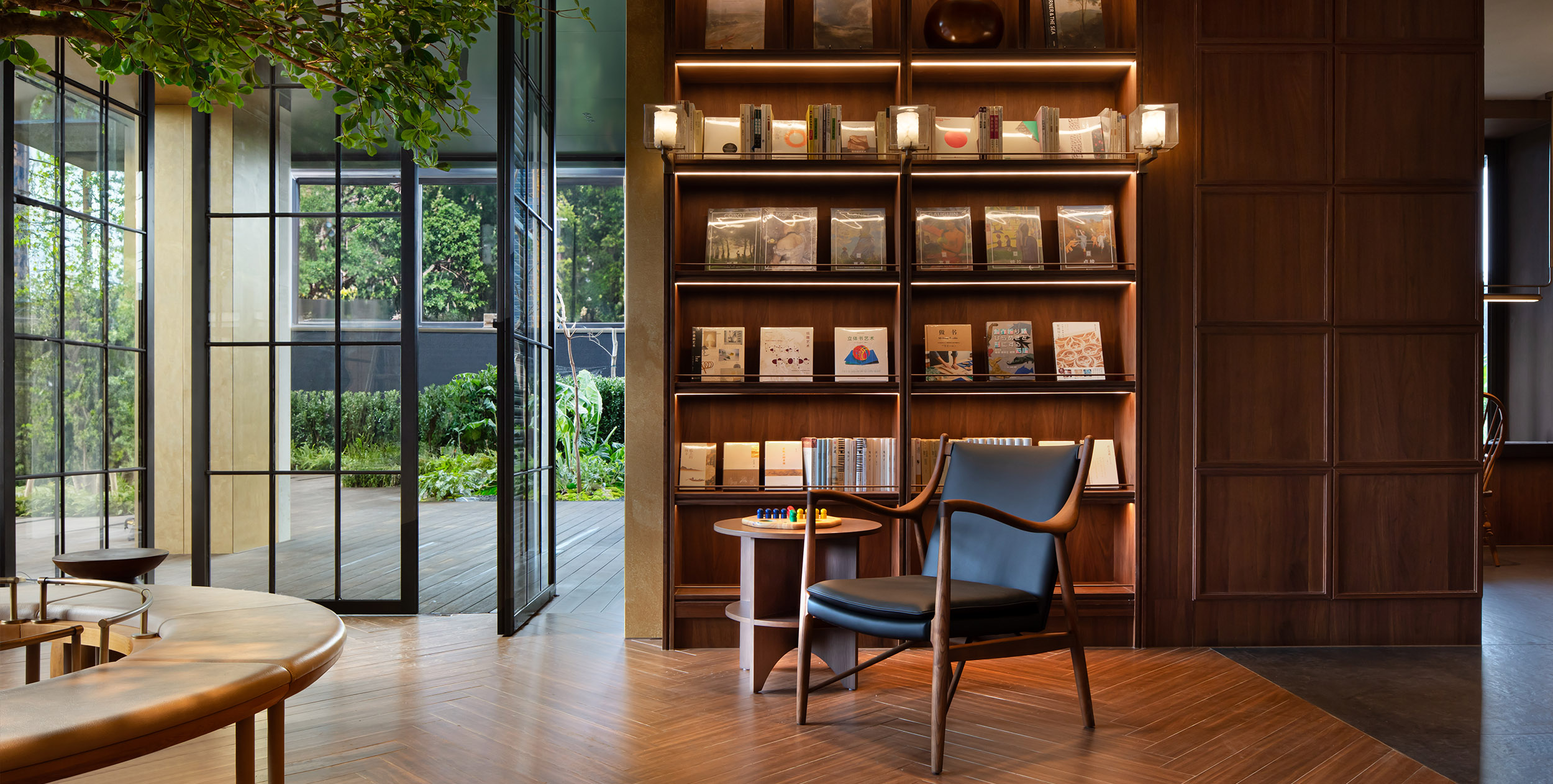 共享书桌为邻里间分享读物与交流心得提供机会,通高书柜则容纳了更多精选书目供住户选择。在家具的多种组合形式下,阅读、探讨、社交等场景都可以在林荫下的开放空间中发生。