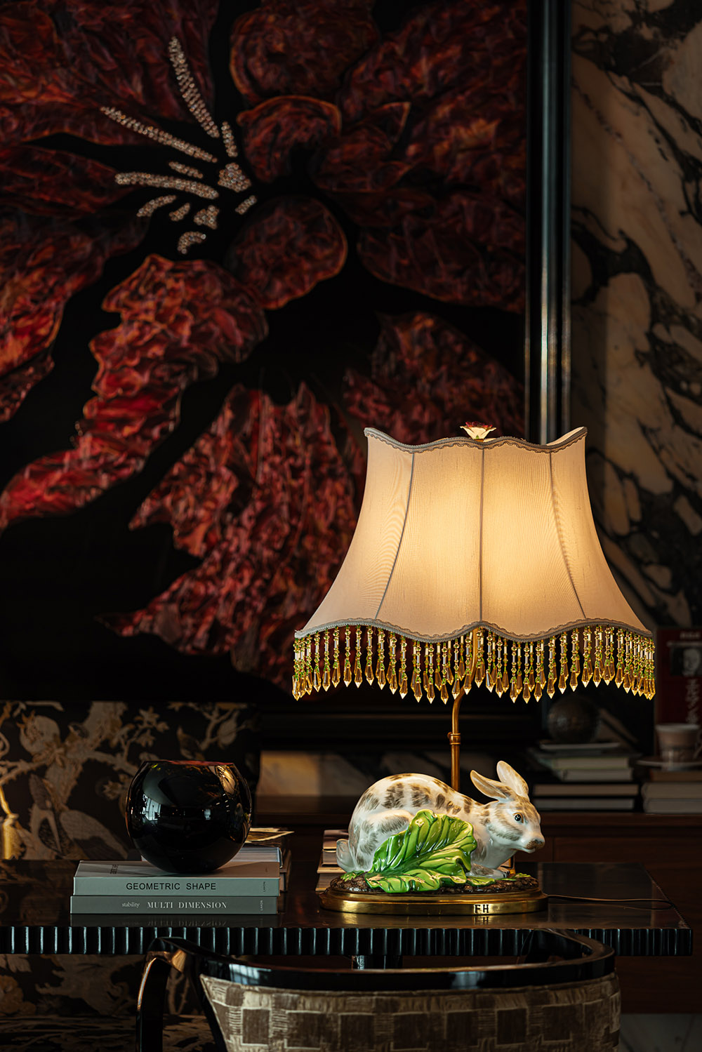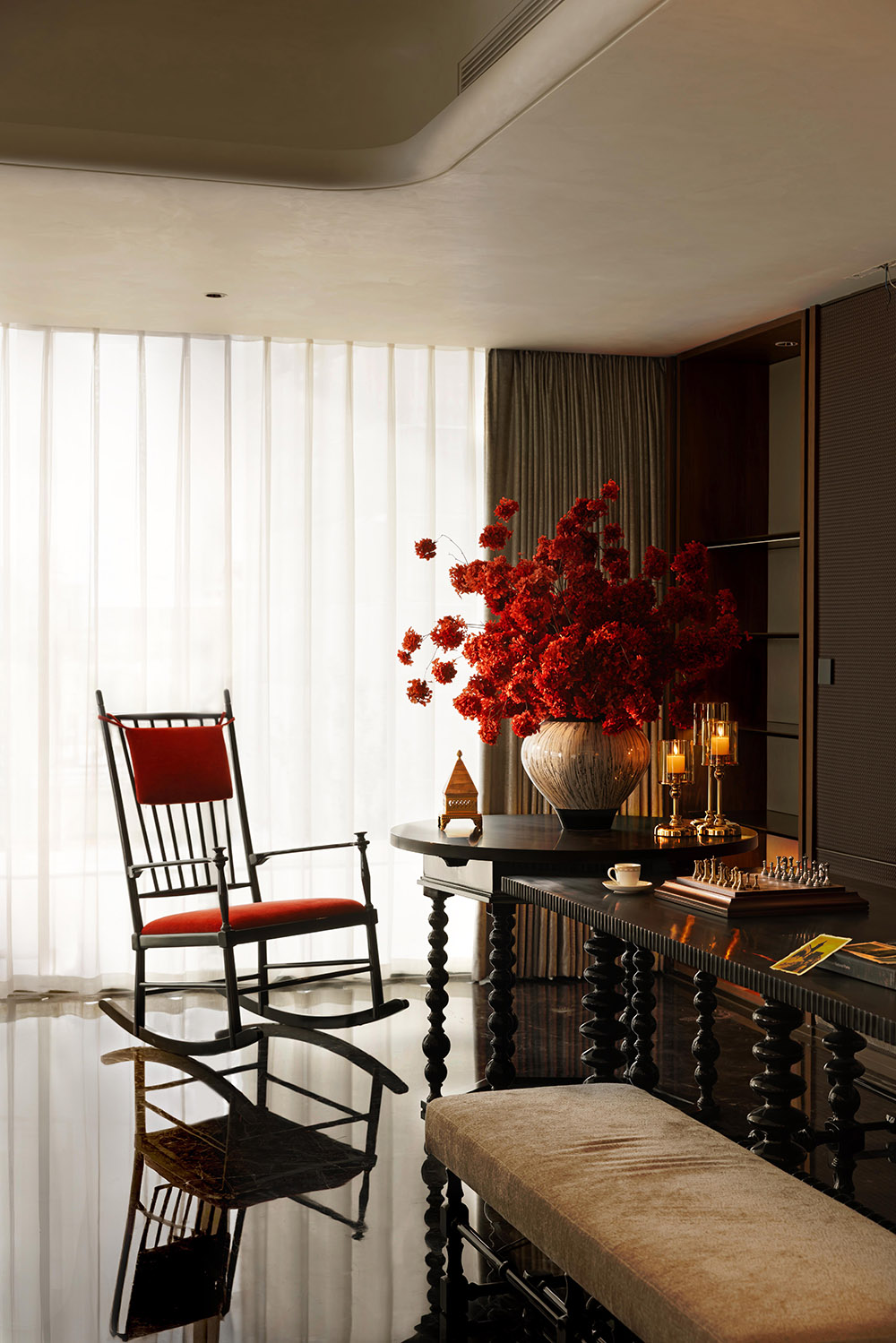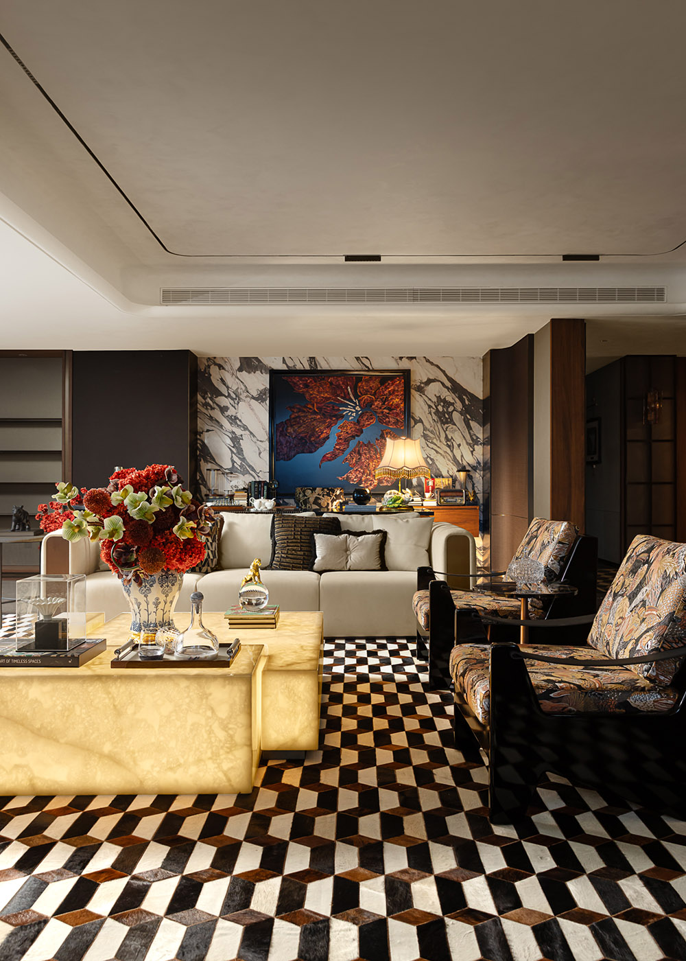 这里是家庭的社交主场,也是艺术生根的土壤。奢石宝格丽紫的硬朗与马毛地毯的复古格纹静静对话,壁炉上的收藏品与游廊悬挂的摄影作品彰显品味。无需刻意叙说风格,但那中西合璧的审美趣味,已悄悄在材质与配色中弥漫。