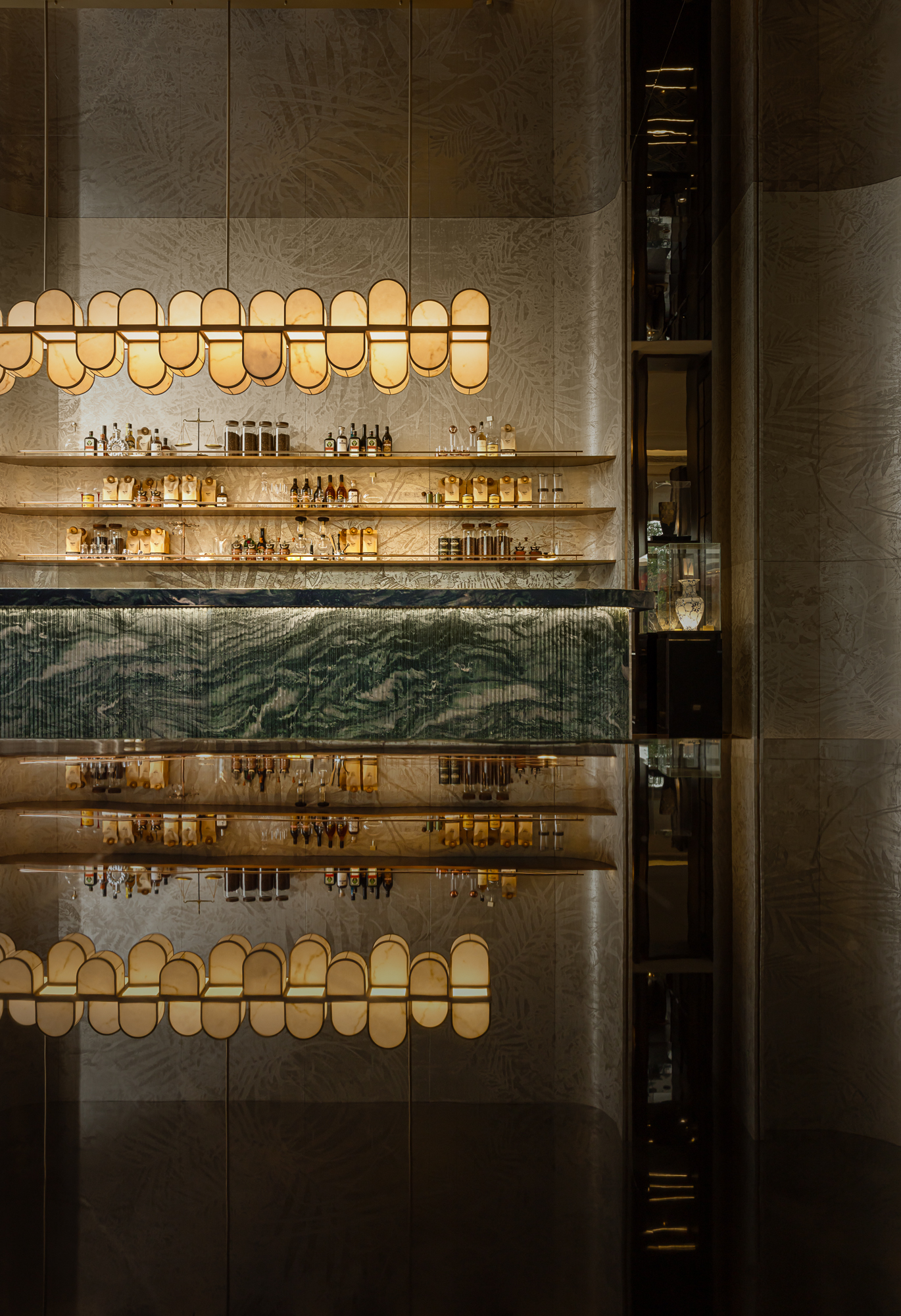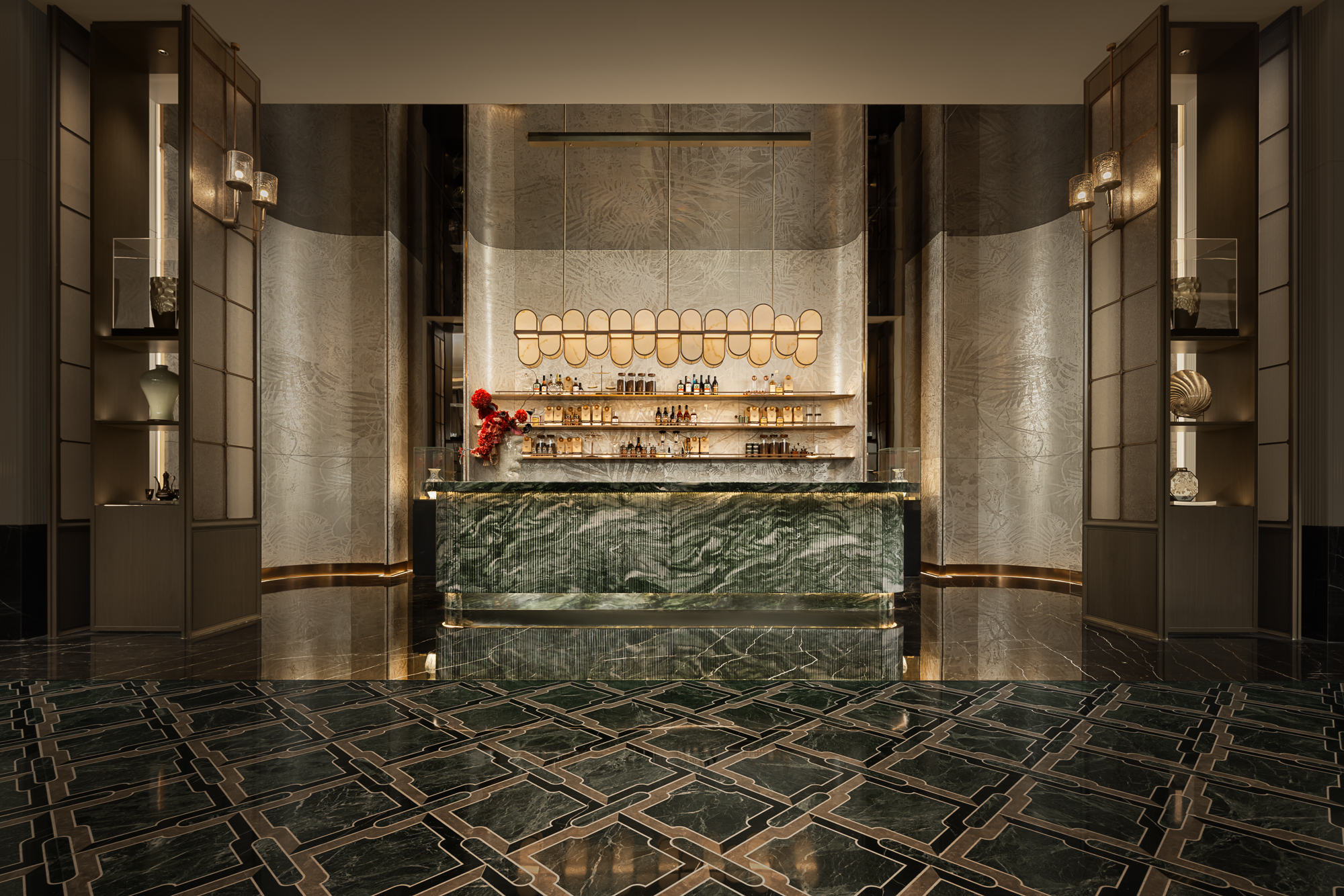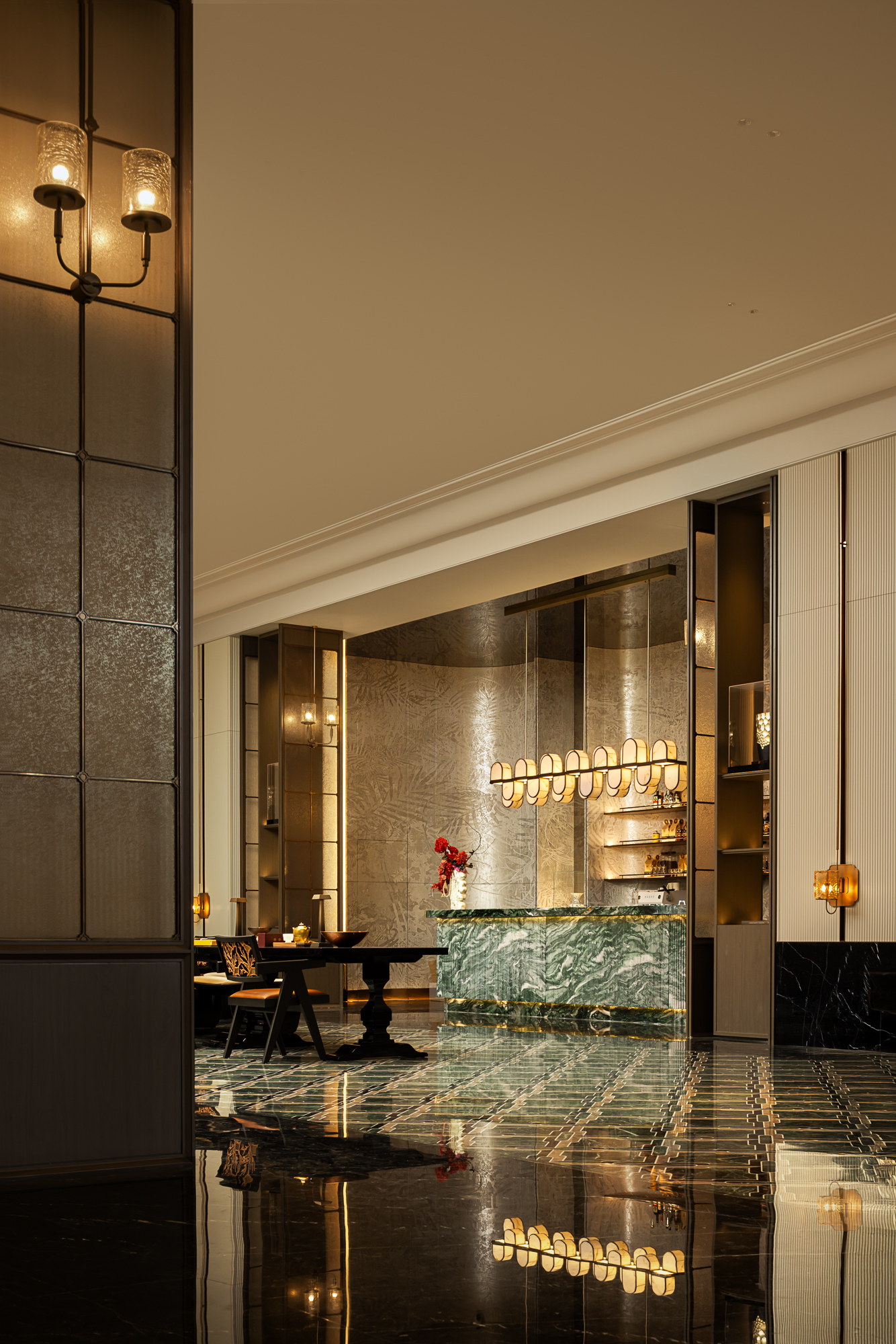 阵列的琉璃灯体裹着光影流动,西洋工艺的剔透中映出中式纹样的细腻,没有繁复装饰,却暗合兼容并蓄的底色。挪威绿奢石之上,悦动的玉石吊灯与琳琅的茶酒杯瓶更是为空间注入轻快的情调。