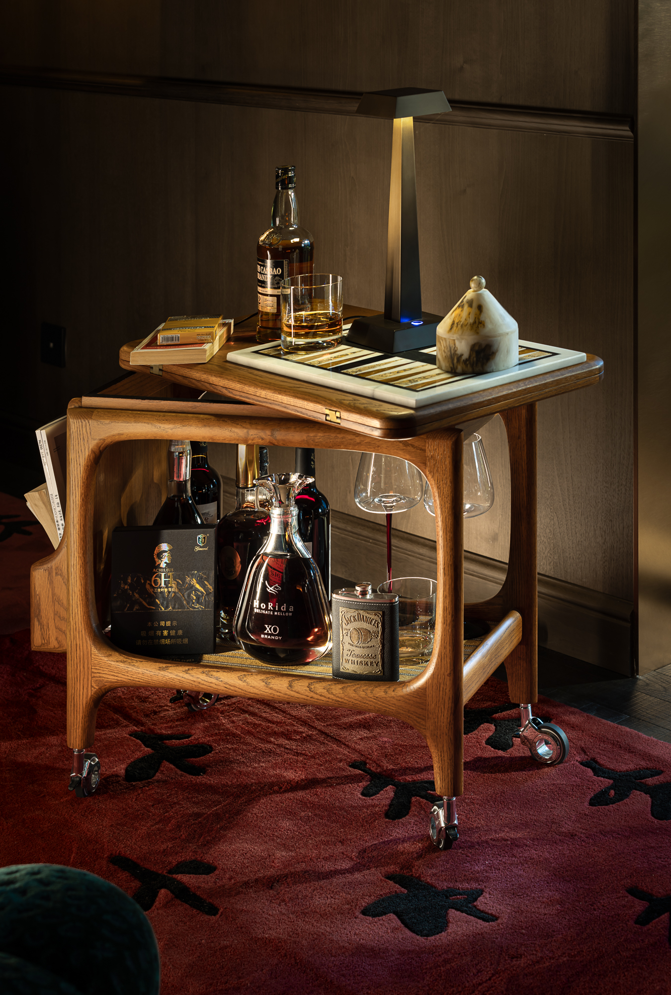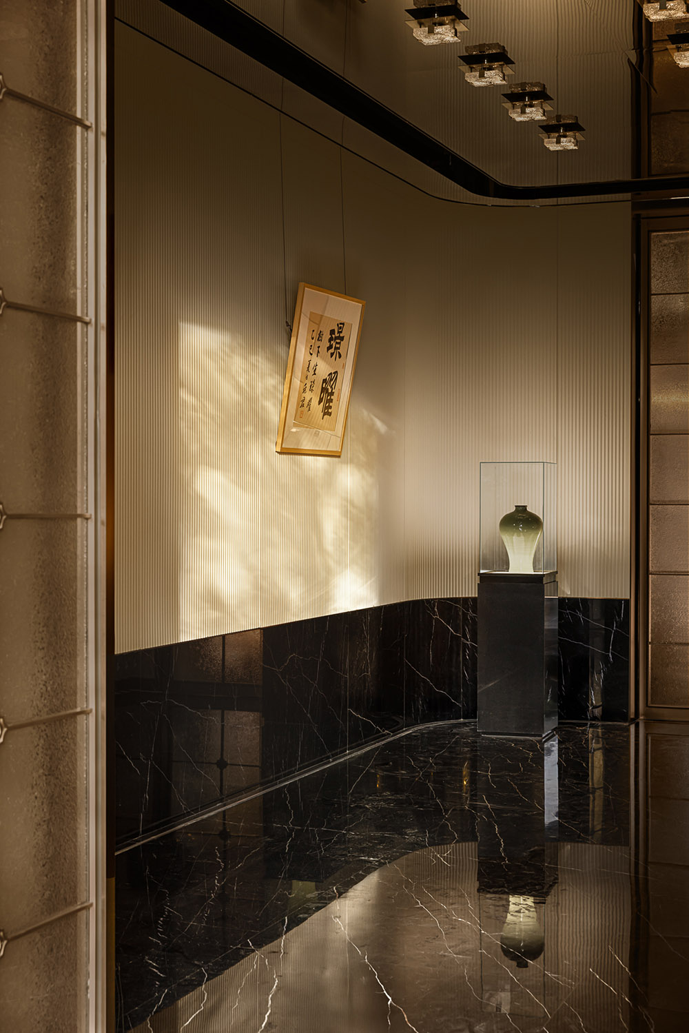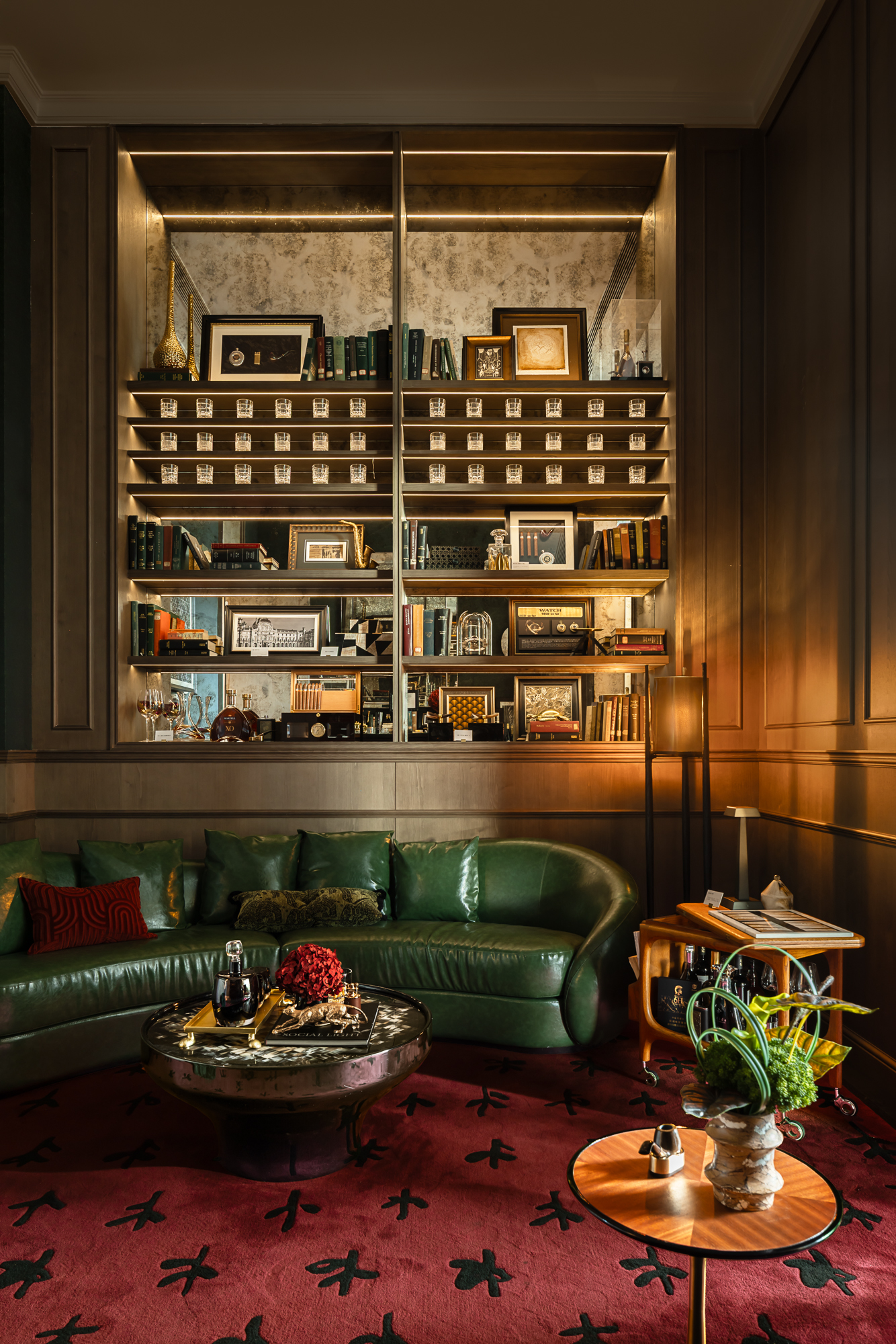 阵列的琉璃灯体裹着光影流动,西洋工艺的剔透中映出中式纹样的细腻,没有繁复装饰,却暗合兼容并蓄的底色。挪威绿奢石之上,悦动的玉石吊灯与琳琅的茶酒杯瓶更是为空间注入轻快的情调。